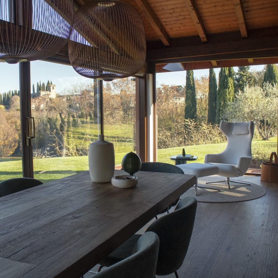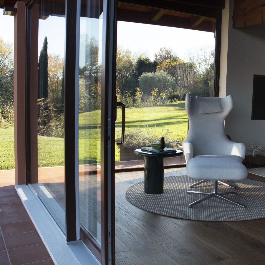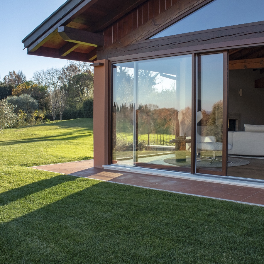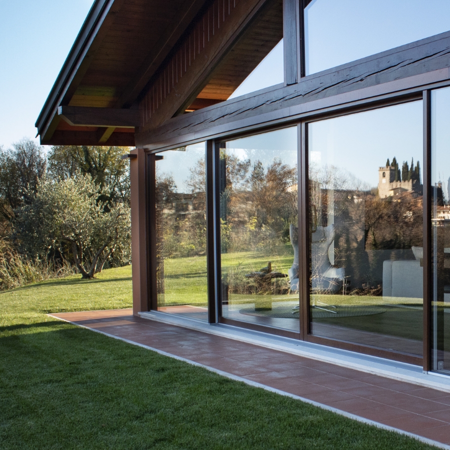 Realizzazione della chiusura del portico esterno integrato nel soggiorno dell’abitazione mediante serramenti in legno su tre lati, il profilo minimale valorizza la vista attraverso ampie vetrate. La finitura è stata realizzata su campione per riprendere il colore delle travi esistenti e armonizzare il serramento con gli elementi strutturali.