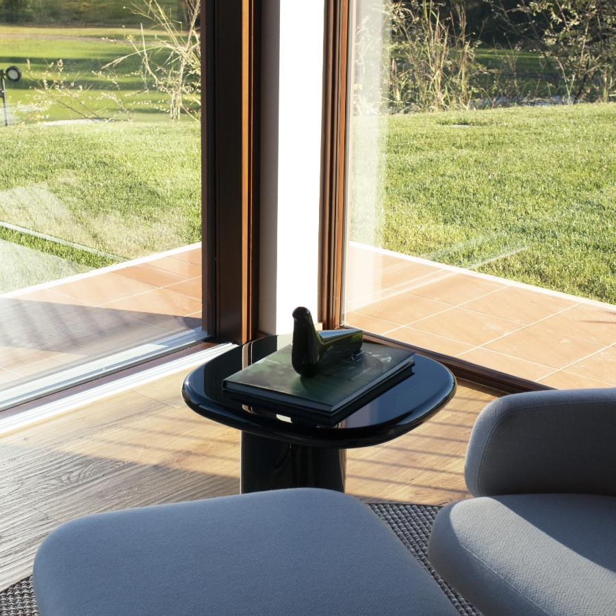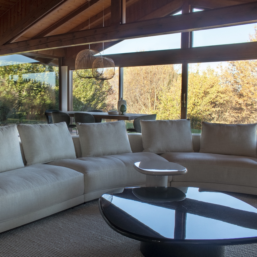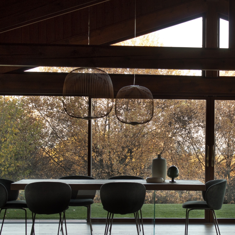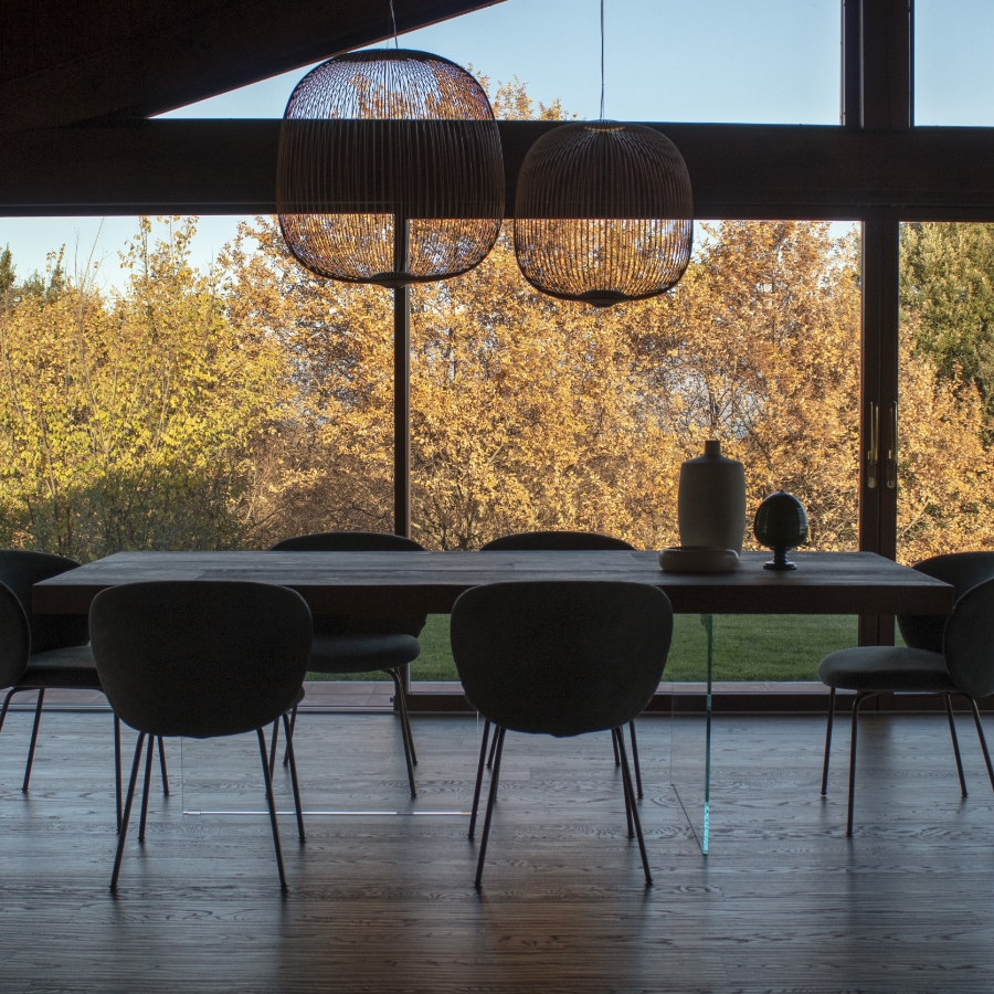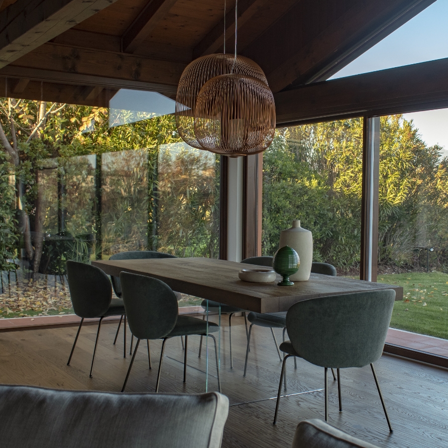 Realizzazione della chiusura del portico esterno integrato nel soggiorno dell’abitazione mediante serramenti in legno su tre lati, il profilo minimale valorizza la vista attraverso ampie vetrate. La finitura è stata realizzata su campione per riprendere il colore delle travi esistenti e armonizzare il serramento con gli elementi strutturali.